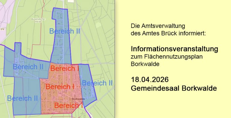 Bekanntmachung Amt Brück Informationsveranstaltung zum Flächennutzungsplan Borkwalde Die Amtsverwaltung des Amtes Brück informiert: Am Samstag, dem 18.04.2026