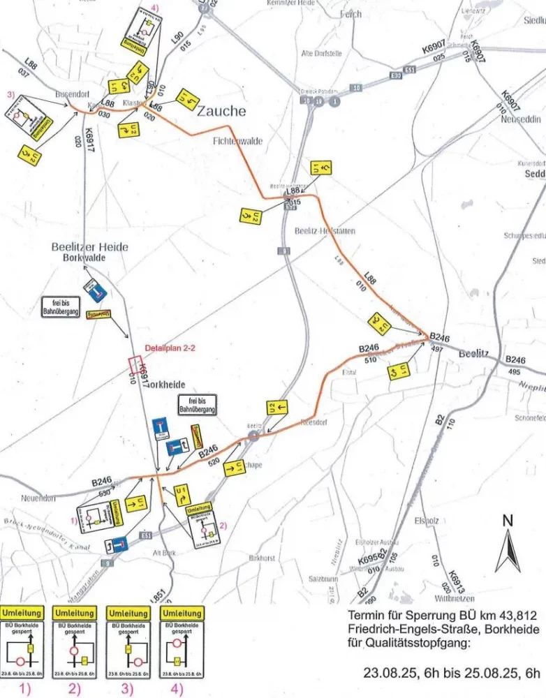 Der Bahnübergang Borkheide wird von Samstagmorgen (23.08.2025 – 06:00 Uhr) bis Montagfrüh (25.08.2025 – ca 06:00 Uhr) voll gesperrt, auch für Radfahrer und Fußgänger. Die Umleitung führt über Fichtenwalde und Beelitz.