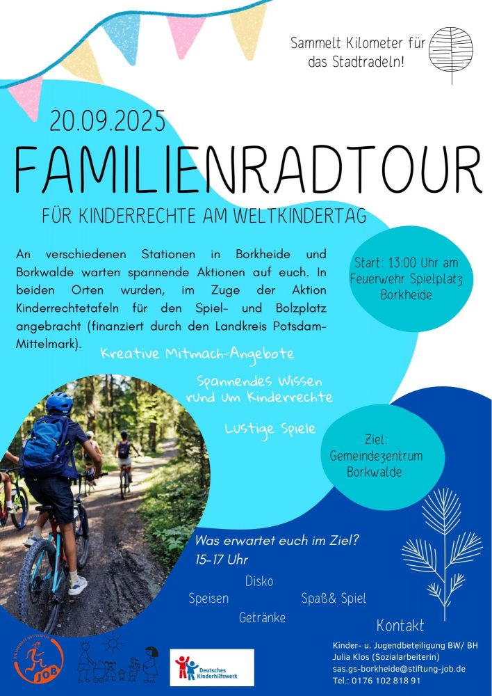 In diesem Zuge haben Kinder der Grundschule Borkheide am 20.09.2025 eine Radtour mit Stationen durch Borkheide und Borkwalde geplant. Los geht`s um 13 Uhr in der Grundschule. Gegen 14 Uhr erreicht der Korso Borkwalde, für alle, die erst hier dazu stoßen wollen. Hier können Kinder und Eltern an drei Stationen etwas über Kinderrechte lernen: in Wichtelwalde in der Kaniner Straße, im Jugendraum in der Lehniner Straße und im Gemeindezentrum. Hier gibt es ab 15 Uhr eine Kinderdisco sowie verschiedene Aktionen für Kinder und Familien.