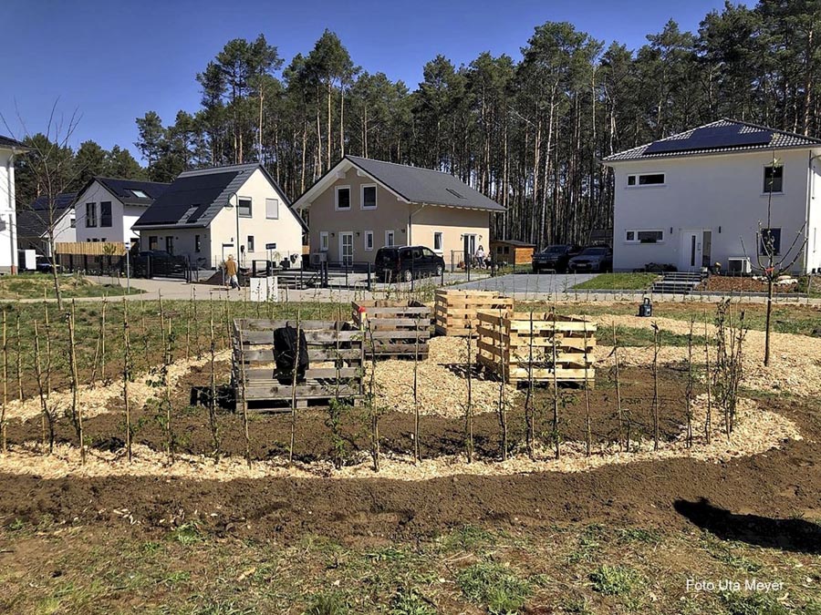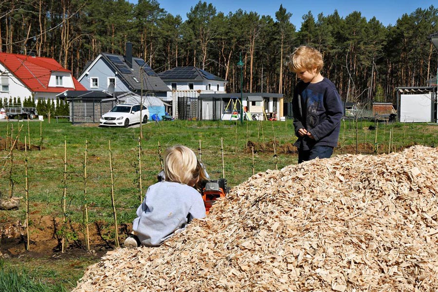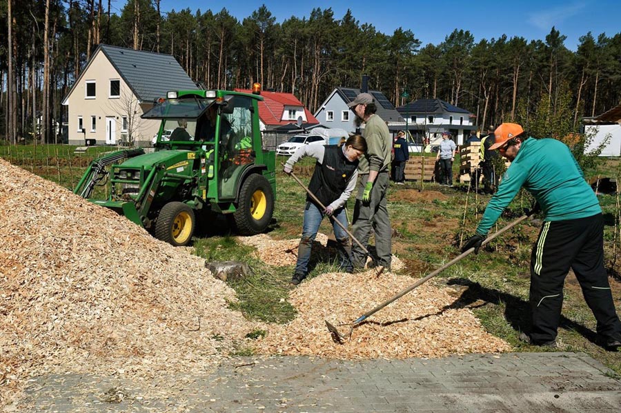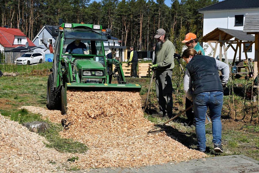 Zum Schluss wurden noch reichlich Holzhackschnitzel für die Wege und die Hecke verteilt. Es war beeindruckend zu sehen, wie aus gemeinsamer Arbeit in kurzer Zeit ein weiterer Begegnungsort entstanden ist.