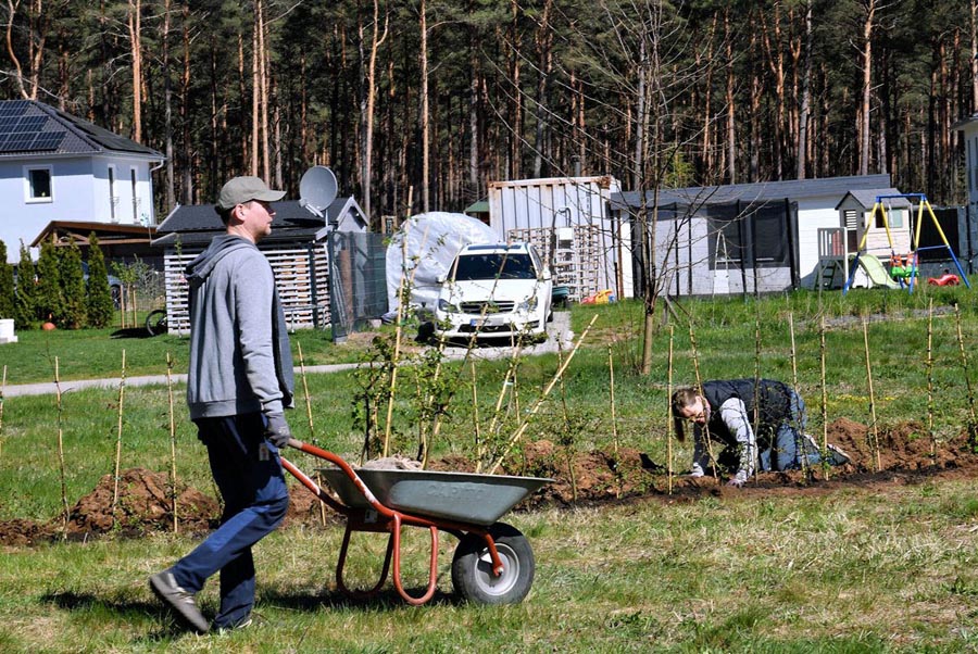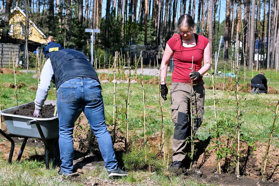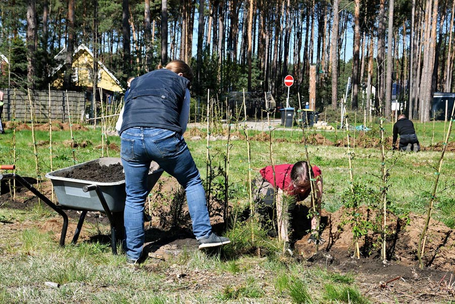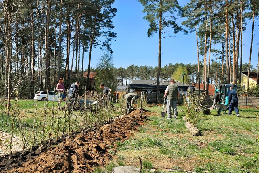 Mit viel Einsatz, guter Stimmung und Teamgeist wurden 450 Hainbuchenpflanzen für eine Hecke gesetzt und 4 Apfelbäume gepflanzt. Für zwei Rasthütten wurden die genauen Standorte festgelegt und aus den Holzbehältern für die Heckenpflanzen kurzerhand Hochbeete vorbereitet.