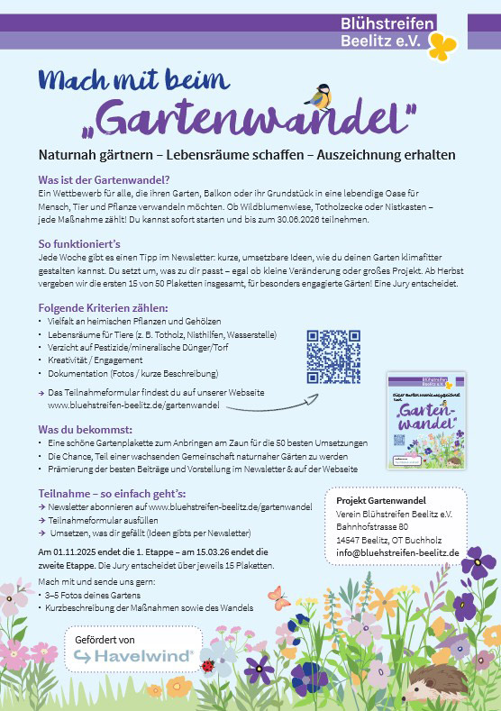 Der Verein Blühstreifen Beelitz e.V. führt einen Wettbewerb „Gartenwandel“ durch, dieser ist nicht auf Beelitz beschränkt. Vielleicht gibt es ja auch Borkwalder Gartenbesitzer die mitmachen wollen. Hier einige Infos: